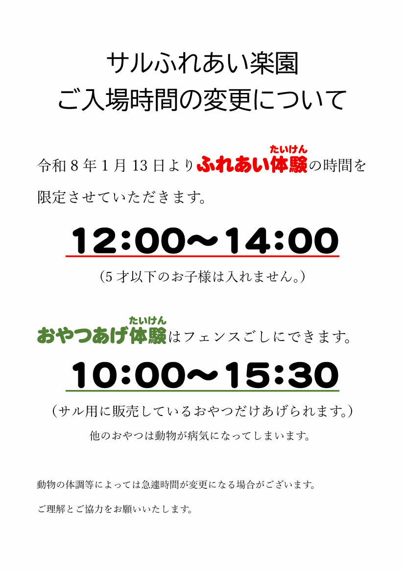 1月13日(火)から当面の間、どうぶつランド側、サルのふれあい広場の入場時間の変更をさせていただきます。ご不便とご迷惑をおかけいたしますが、どうぞ宜しくお願いいたします。